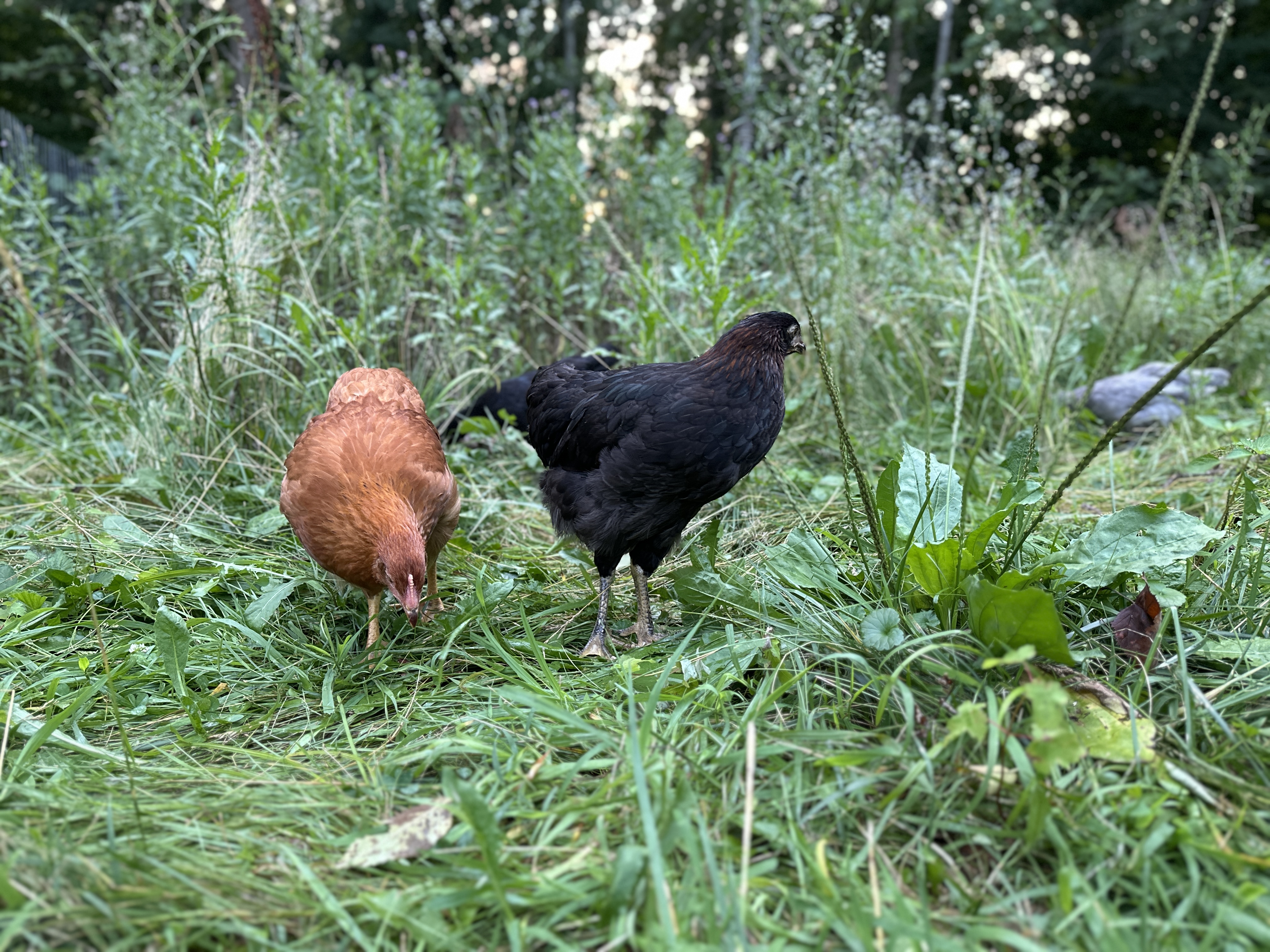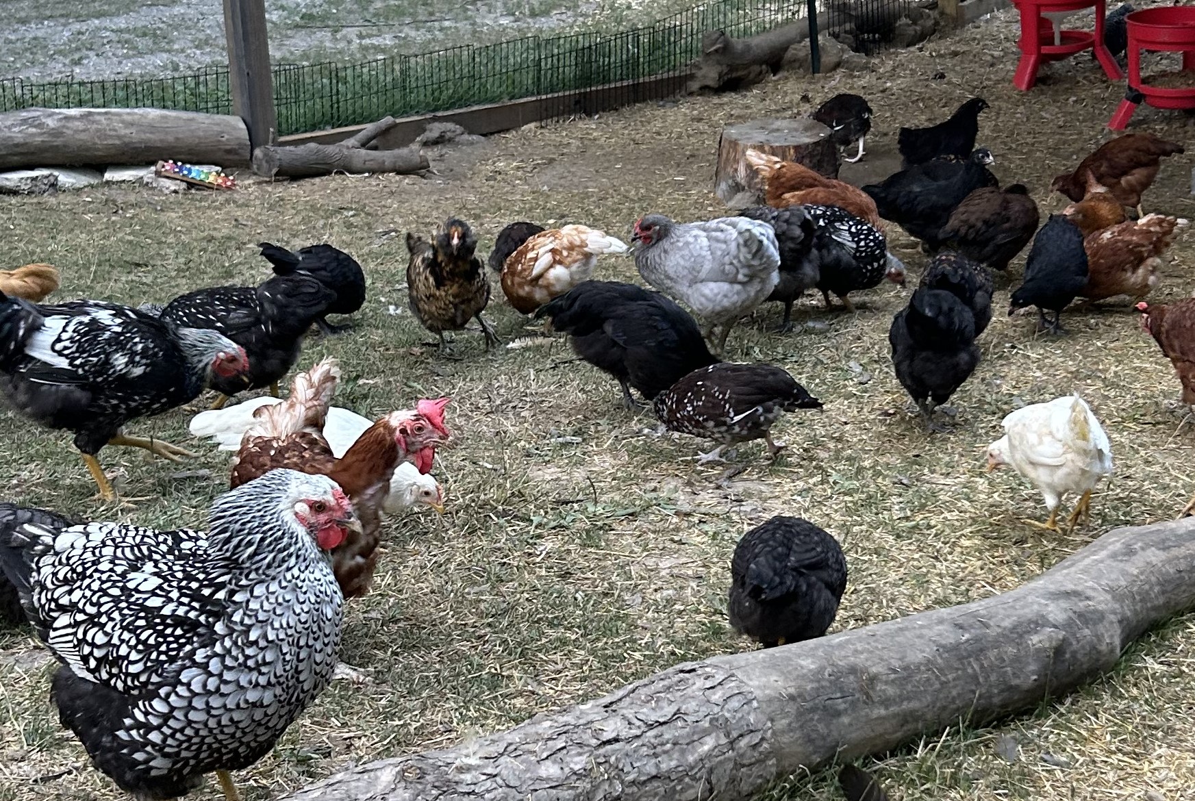 To the west of the Hen House we have about 1,250 square feet of fully-enclosed space for the chickens with multiple sources of food, vitamins and minerals, fresh water, and things to play with! Every chicken can move freely between the hen house and this outdoor free-range area throughout the day.