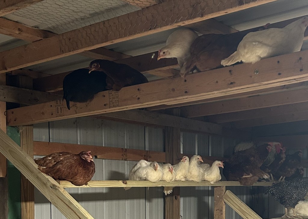 Chickens are housed in a combination of indoor (called a “Hen House”) and outdoor (called a “Chicken Run”) spaces. On our farm, we have two large connected hen houses with over 1,500 square feet of useable space for the chickens. The chickens have access to nesting boxes (to lay eggs), roosting bars (where they sleep), fresh water, and food!