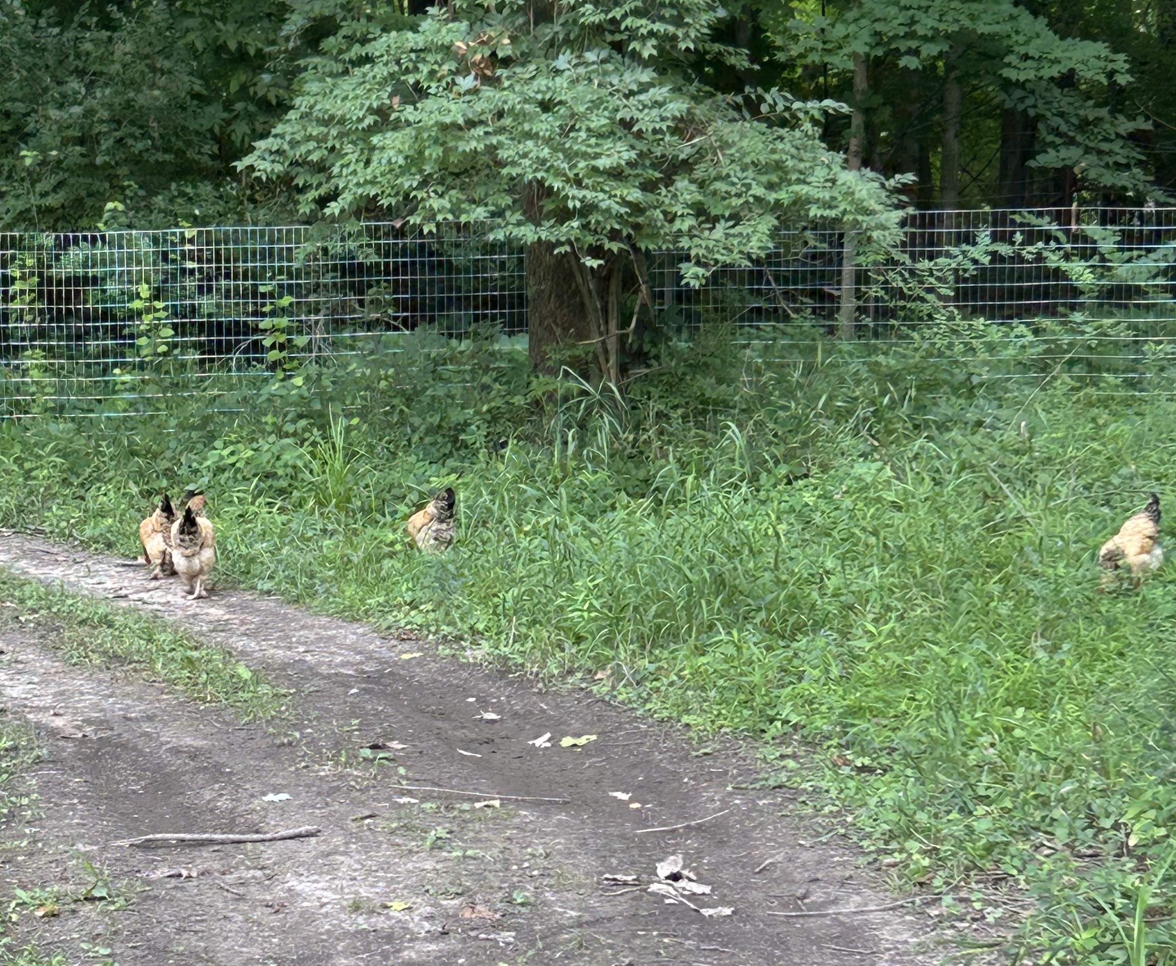 To the east of the Hen House, we have about 10,000 square feet of fenced in pasture for the chickens. With a few exceptions (e.g., severe weather, health/safety, construction) the chickens have complete freedom to come and go into the pasture as they choose! It’s feels a bit like Jurassic Park!